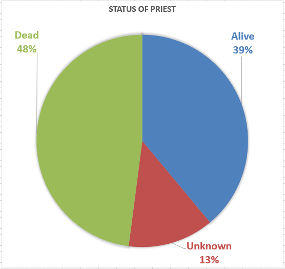 For those interested, I went back and recorded whether the accused priests are alive, dead, or unknown. The case files give a date for the death. If it says N/A, I assumed that means alive. It also lists "unknown".